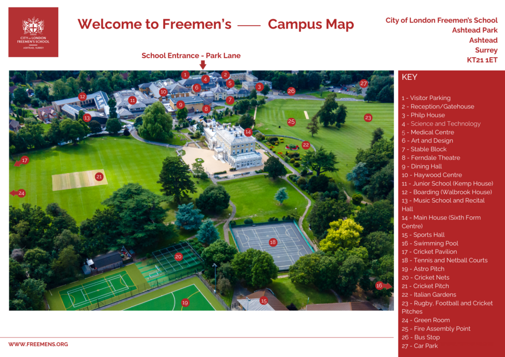 From the M25 (J9), follow signs to Ashtead via the A24, then turn into Park Lane near St Giles Church. The School entrance is at the top of the hill.