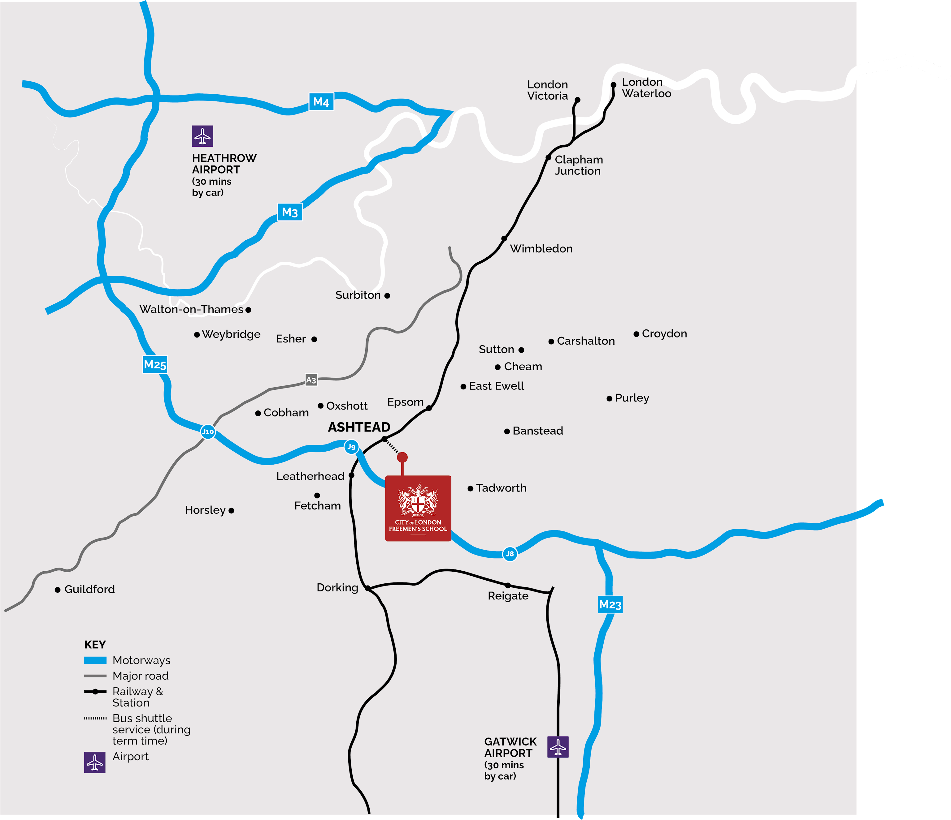Ashtead Station is a 20 minute walk from the School and we also offer a shuttle service to school from the station.