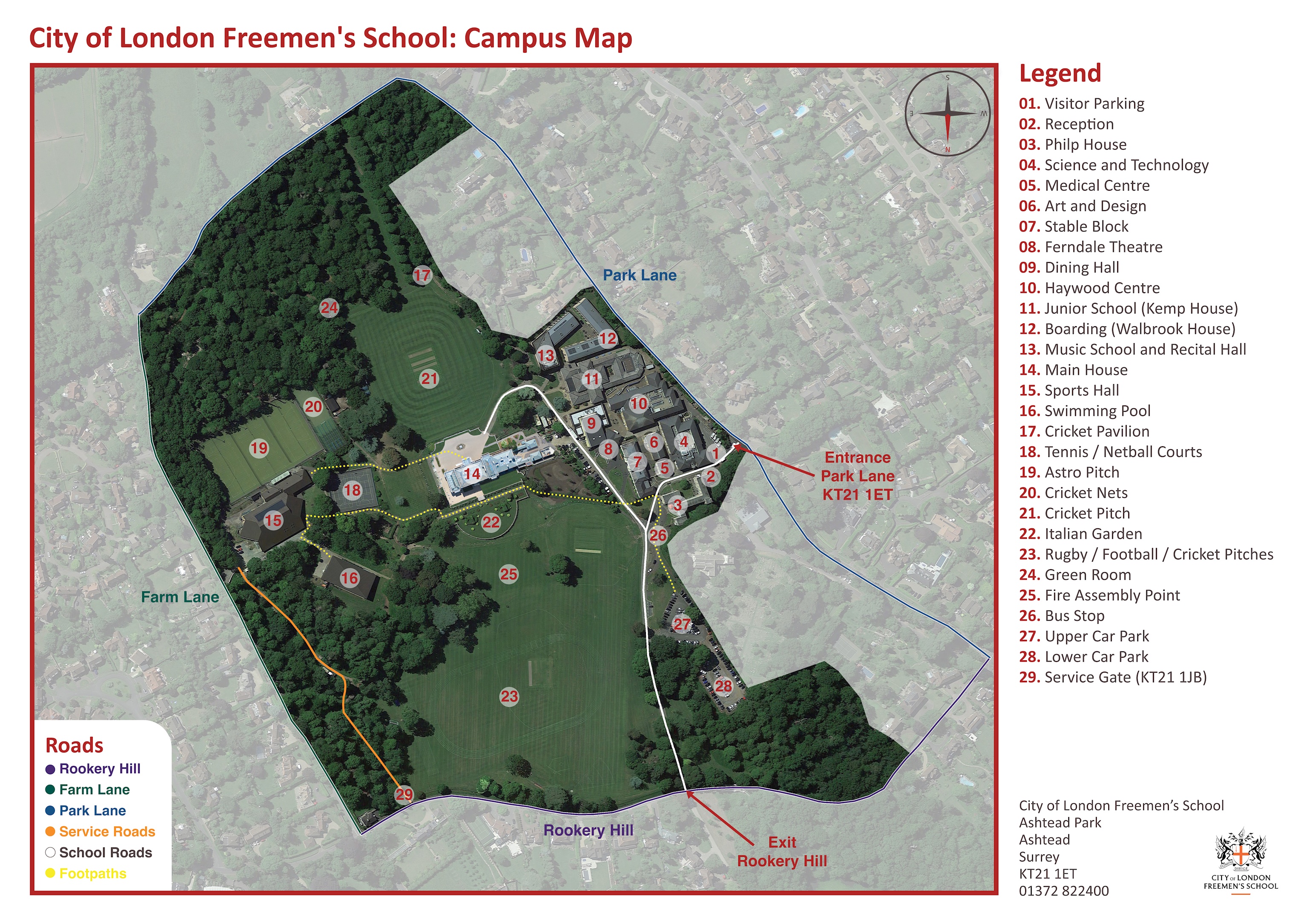 - From the M25 - Exit at Junction 9 (East or West). Follow the signs for Leatherhead and Dorking (A24). At the roundabout at the top of the hill, follow the signs for Ashtead (first exit). Go through Ashtead Village and towards the end of The Street turn right into Park Lane – look for the sign for St Giles Church on your right. At St Giles’ Church entrance the road bears sharp right – turn left immediately after the bend – this is still Park Lane. The entrance to the School is on your left at the top of the hill.
