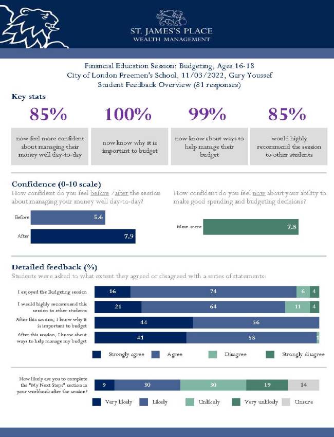 I delivered a financial education workshop to Sixth Formers at the school and I realised how eager the students were to understand more in this area. A survey of over 80 students found that, after participating in the workshop, 85% of them felt more confident about managing their money day-to-day and 99% of them felt better equipped to manage their budget going forward. Indeed 100% of the students suggested that, after having had the session, they now knew why it was important to budget. This can only be a positive for them as they embark on the next stage in their lives.